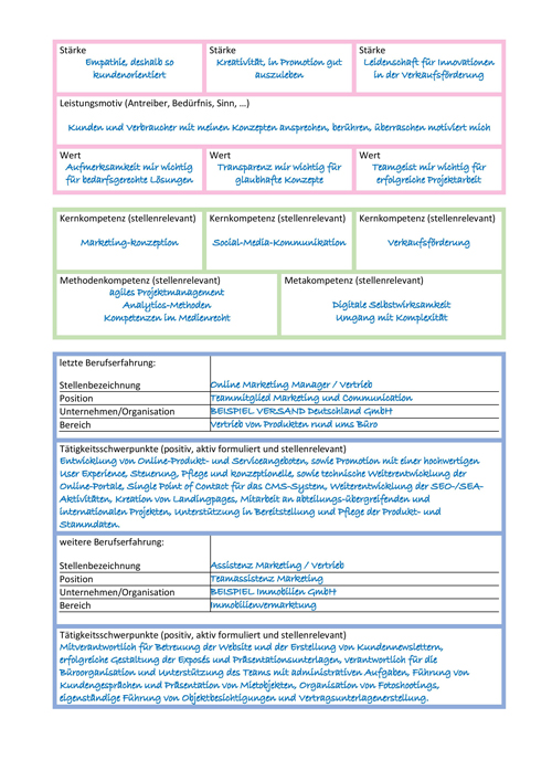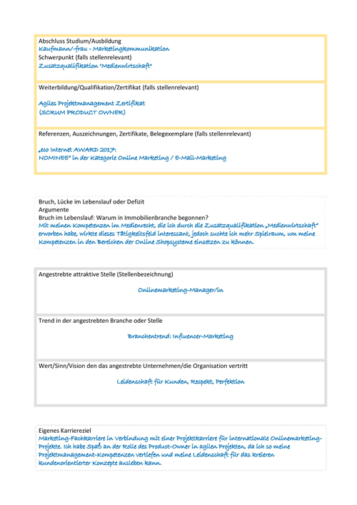 Diese Vorlage lässt sich sehr gut zum Üben nutzen. Da sie nur aus Stichpunkten besteht, kann man einzelne Bausteine je nach Stellenausschreibung austauschen und durch andere Anforderungen, die man ebenfalls erfüllt ersetzen. Über die persönliche und berufliche Entwicklung werden sich nach und nach, weitere Bausteine als nicht mehr relevant zeigen und durch neu gewonnene Kompetenzen, Erfahrungen, Erfolge, usw. ersetzt werden.